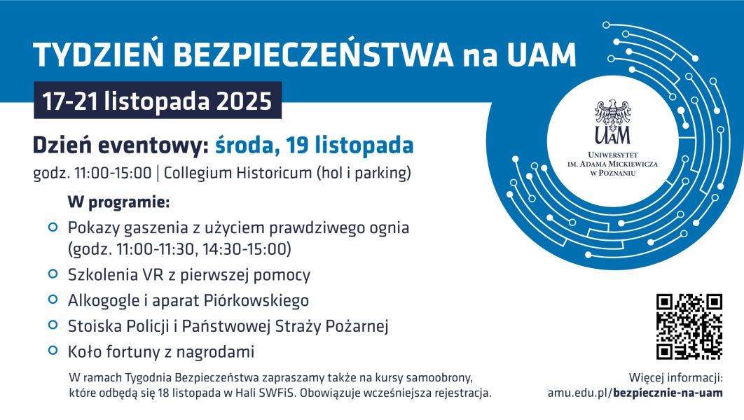 W dniach 17–21 listopada 2025 r. na terenie kampusu Morasko odbędzie się Tydzień Bezpieczeństwa na UAM.Wydarzenie stanowi część kampanii społecznej „Bezpiecznie na UAM”, której celem jest dostarczenie społeczności uniwersyteckiej praktycznej wiedzy i umiejętności dotyczących zachowań zwiększających bezpieczeństwo na terenie uczelni.Kursy samoobrony W ramach wydarzenia zaplanowano szereg atrakcji łączących teorię z ...