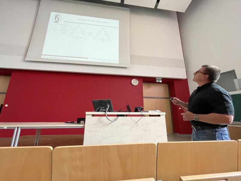Wykład zatytułowany „Geometria molekularna – syntezy, modyfikacje i wybrane aplikacje makrocyklicznych pochodnych trans-1,2-diaminocykloheksanu” spotkał się z dużym zainteresowaniem słuchaczy.