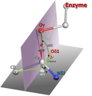 Rysunek przedstawia ogólny schemat ataku grupy nukleofilowej enzymu na grupę amidową substratu (asparaginy).