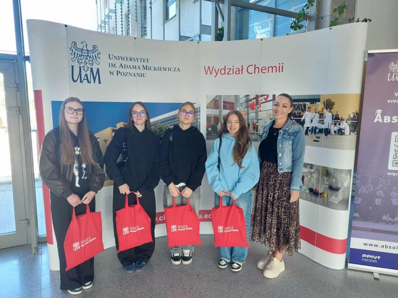 Uczennice klasy 4b z Liceum Ogólnokształcące w Międzychodzie wraz z opiekunką, p. Karoliną Nowak, rozpoczęły staż od powitania przez Prodziekana prof. Marcina Podsiadło i otrzymania upominków. Następnie miały okazję poznać nowoczesną aparaturę wykorzystywaną w badaniach chemicznych, m.in. dyfraktometr proszkowy oraz spektroskop fotoelektronowy. Podczas zajęć w Zakładzie Chemii Koordynacyjnej przeprowadziły doświadczenia ze związkami o właściwościach magnetycznych.