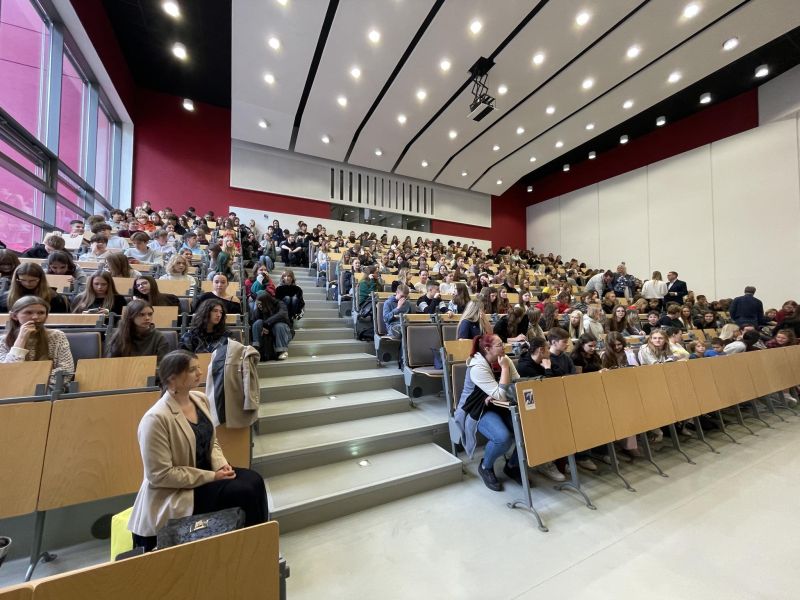 Dzięki wsparciu studentów naszego Wydziału (Bernadetty Kuleczki i Gracjana Russa) wykład uzupełniły również efektowne pokazy chemiczne, które pozwoliły na żywo zobaczyć, jak zmienia się zachowanie substancji w różnych warunkach.